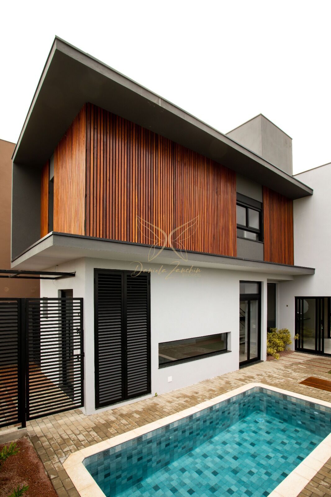 A piscina ocupa lugar de destaque, ficando visível desde a entrada da casa, mas também pode ser contemplada a partir da sala de estar, da cozinha e da churrasqueira. Foi projetada com área para as cadeiras de sol e contornada pelo jardim. Internamente, a casa possui acabamentos de alta qualidade, como porcelanato para o piso, pedras preto São Gabriel nas bancadas da cozinha e da churrasqueira e esquadrias personalizadas pela casa toda com automação nos dormitórios. O projeto de design de interiores segue como um bônus para quem adquirir o imóvel.